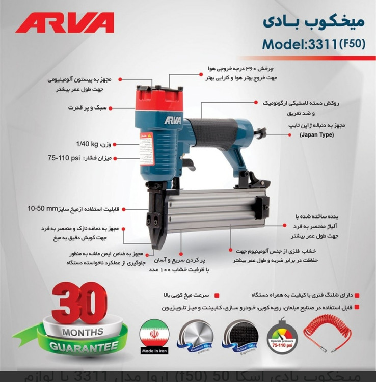 لوازم جانبی درون بسته: دفترچه راهنمای محصول، کارت گارانتی، آچار آلن، شلنگ فنری، روغن قطعات فنی: خشاب و ماشه سختکاری شده، پیستون آلومینیومی، دسته ارگونومیک قابلیت: میخکوبی با سرعت و قدرت بالا مجهز به کوپلینگ طرح ژاپن وزن دستگاه: ۱.۴۰ کیلوگرم میزان فشار: ۷۵ تا ۱۱۰ PSI ظرفیت خشاب: ۱۰۰ pcs سایز میخ: ۱۰ الی ۵۰ میلیمتر موارد مصرف: صنعتی و نیمه صنعتی سبک و پر قدرت مدت گارانتی: ۳۰ ماه